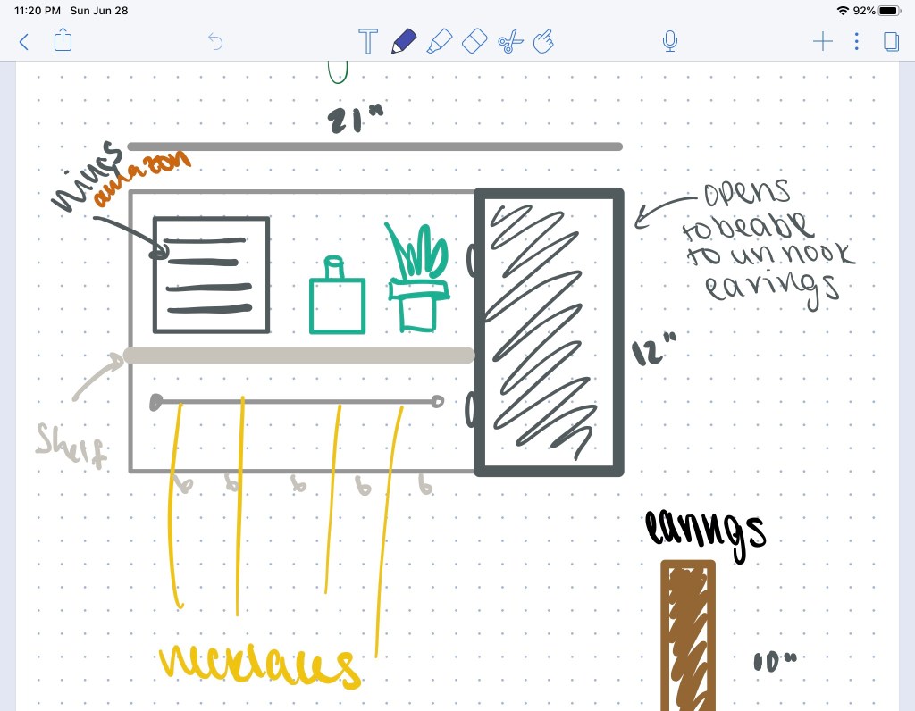 I recently picked up a new iPad Pro for school and have found it quite useful for designing DIYs. I use apps Notes and Notability- Notes if free and comes on any IOS device, Notability on the other hand costs about $8.99 but is amazing for student note-taking! I use this as an expensive notepad but I find it a lot easier to adjust plans without having to redraw them. It also has a great camera to take before and after pictures!